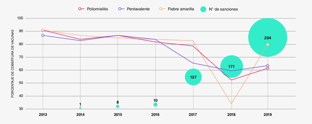 Entre 2017 y 2018, Venezuela experimentó una caída estrepitosa en la cobertura de vacunación, particularmente en inmunizaciones esenciales como la fiebre amarilla. Este retroceso coincidió con el endurecimiento de las sanciones económicas y financieras que obstaculizaron la adquisición de biológicos a través del Fondo Rotatorio de la Organización Panamericana de la Salud (OPS). La Relatora Especial de la ONU, Alena Douhan, advirtió en 2021 sobre el “efecto devastador” de estas medidas y señaló que la obstrucción para la compra de vacunas a través de la OPS privó a aproximadamente a 2,6 millones de niños de dosis contra enfermedades como el sarampión y la fiebre amarilla.