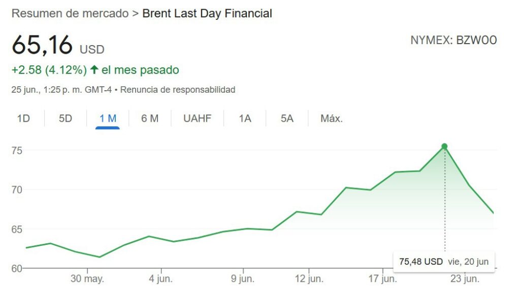 La tendencia al alza, para el viernes 20 de junio, alcanzó un cenit hasta los 75 dólares por barril, con altas expectativas de que Estados Unidos se involucrara en la guerra.